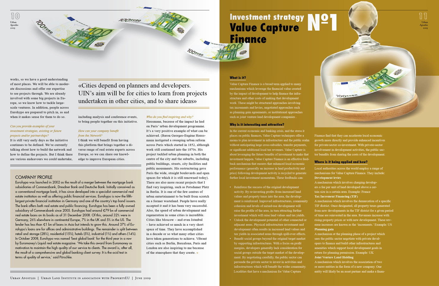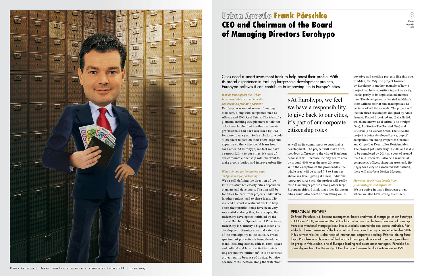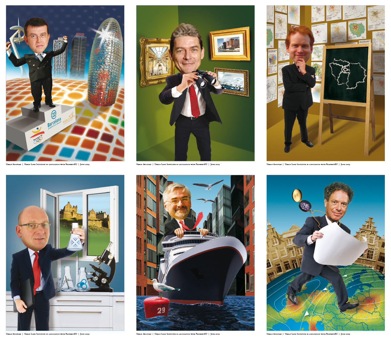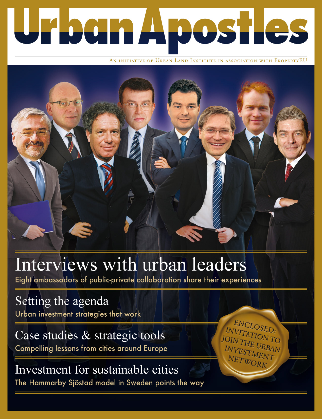 magazine on strategies for city development by 8 decision makers in professional real estate, the 'urban apostles' illustrated as caricatures.